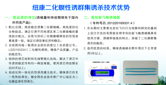 昆蟲(chóng)性誘劑產(chǎn)品是仿生高科技產(chǎn)品,通過(guò)誘芯釋放人工合成的性信息素化合物,并緩釋至田間,引誘雄蛾至誘捕器,并用物理法殺死雄蛾,從而, 破壞其交配,最終達到防治的目的。寧波紐康生物技術(shù)有限公司開(kāi)發(fā)的二化螟化學(xué)信息素產(chǎn)品,引誘力強,防治效果明顯,使用簡(jiǎn)便,價(jià)格合理。誘殺效果優(yōu)于目前國內同類(lèi)產(chǎn)品,已成為國家農業(yè)部農業(yè)技術(shù)推廣中心的推廣產(chǎn)品。